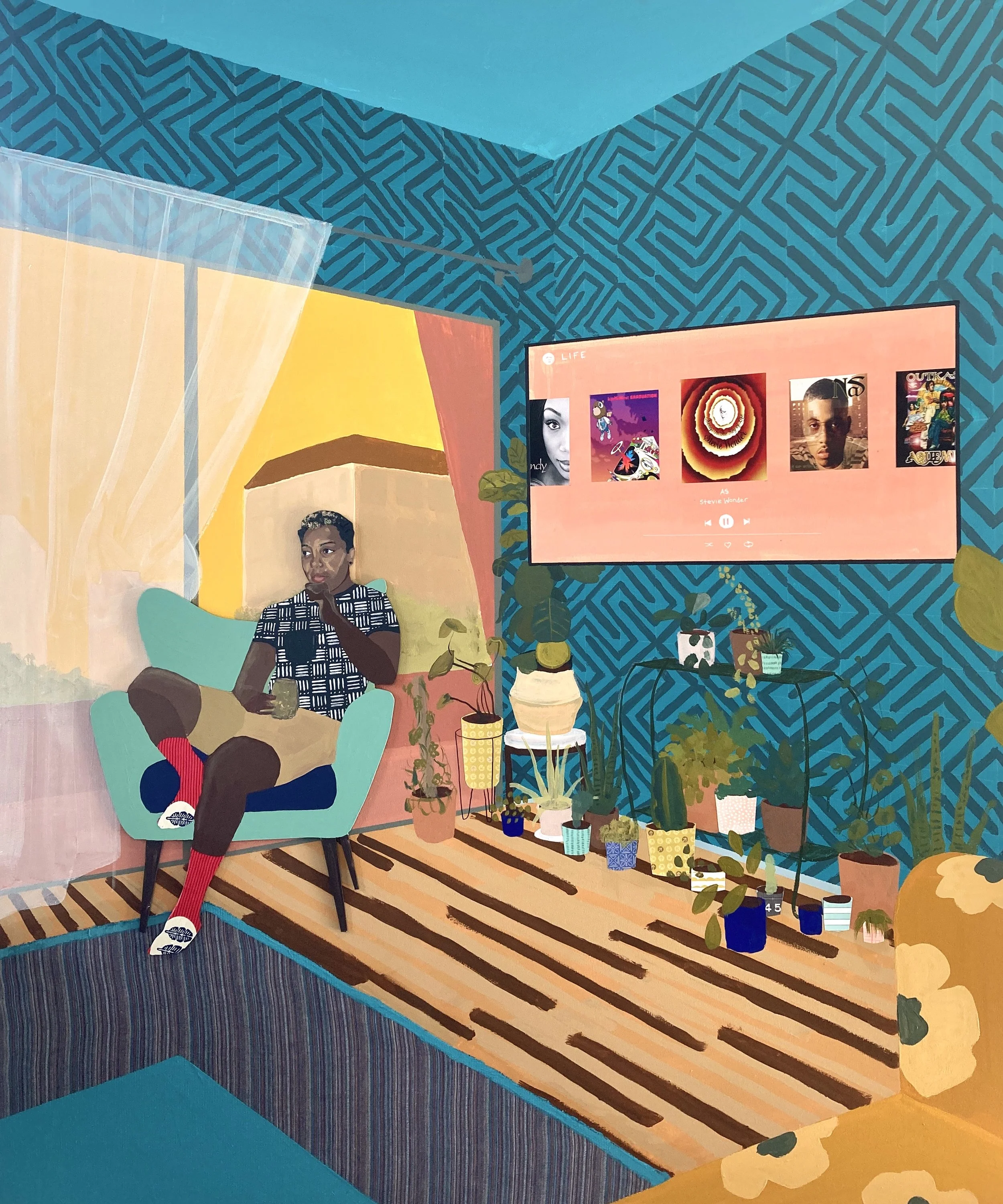 House paint, acrylic, pen and ink, masonite and inkjet prints on canvas